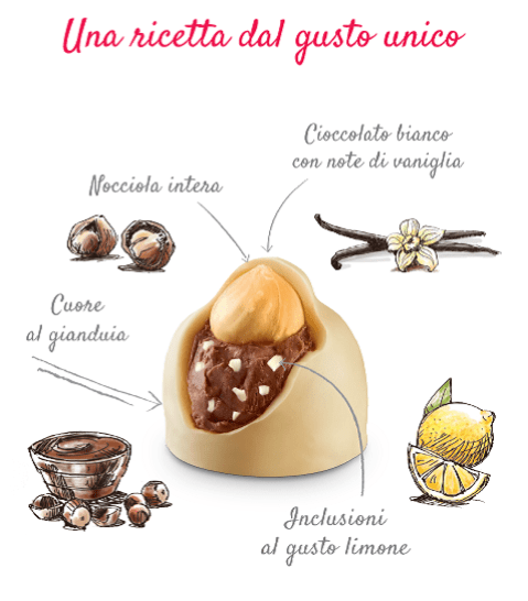 Ingredients: sugar, hazelnuts 20%, cocoa butter, skimmed milk powder , cocoa mass, pieces with lemon flavor 3.5% (glucose, maltodextrin, natural lemon aroma with other natural aromas), powdered milk , dried whey , anhydrous butter , emulsifier sunflower lecithin, natural vanilla aroma. May contain other nuts. Gluten-free product. Store in a dry place away from heat sources. Nutritional information per 100g: energy value 2302kJ / 552kcal, fats: 33.8g, of which saturated fatty acids 13.7g, carbohydrates: 53.8g, of which sugars: 51.9g, fiber: 2.8g, protein: 6, 3g, salt: 0.14g. Country of origin: Italy.