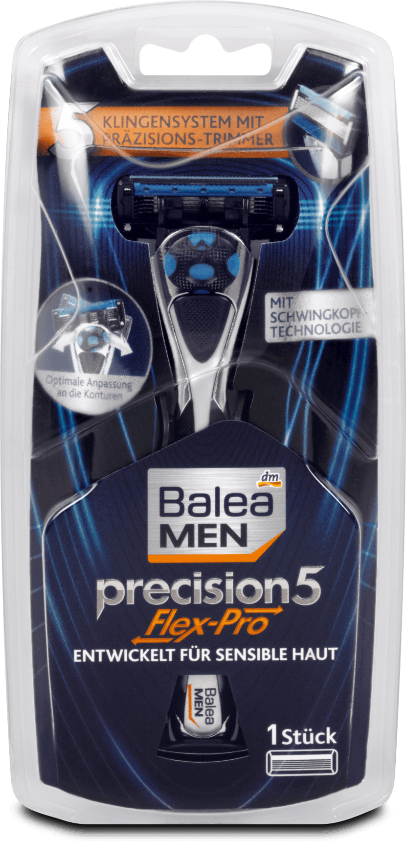 The Balea MEN Precision5 shaver with a special alignment blade enables a thorough and safe shave. The new flexible head technology adapts perfectly to the contours of the face. Easy Clean head washes easily. The cutting edges are refined with ceramics, which guarantees their long service life. The flush edge shaves seamlessly even hard-to-reach places. The moisturizing waistband with vitamin E and aloe vera ensures a slight slip on the skin and prevents irritation.