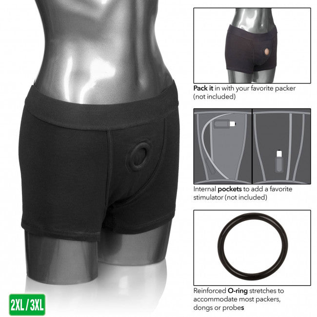 These aren't just any ordinary boxers! They offer support, comfort and a pocket for a dildo or stimulator. Their men's cut is based on classic boxers and the O-ring will serve you as you wish. Fall in love with the nice and stretchy cotton and spandex for maximum comfort.