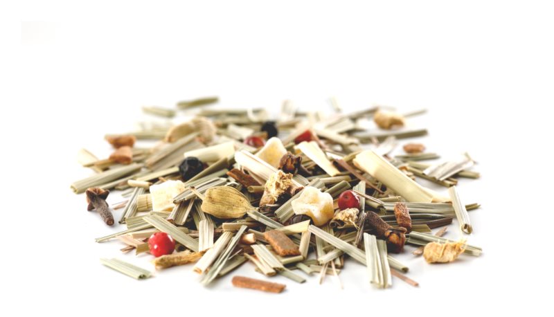 - lemongrass leaves 36.2%, cinnamon, ginger, cardamom, sweetened pineapple chunks 5% (cane sugar, pineapple 22%, fructose), cloves, black pepper, pink pepper, natural cinnamon flavor with other natural flavors