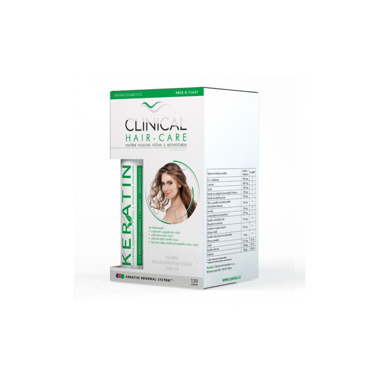 The pack contains 120 capsules of Clinical Hair-care and Keratin 100 ml regeneration cure.