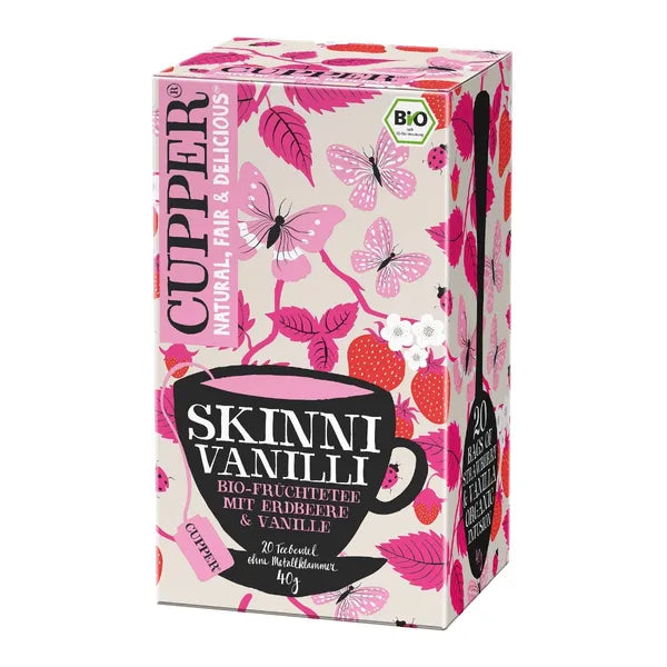 Enjoy a cup of delicious, almost creamy tea with the taste of strawberry and vanilla! The intense taste and aroma of Cupper BIO Skinni Vanilli tea will remind you of hot sunny days and bring you back to the summer wave at any time of the year. The sparkling red color, intoxicating aroma and delicious taste of strawberries will satisfy any lover of fruit drinks and chase away the desire for sweets. The tea does not contain any acidic herbs and therefore it is not necessary to sweeten it . This makes it the perfect drink for your whole family.