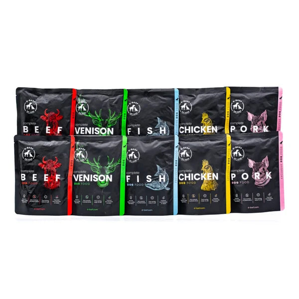 D-Barf Mix complete is a complete food for adult dogs of all breeds . The package consists of 10 pouches with juicy pieces of beef, chicken, pork, salmon and venison with selected vegetables, fruits and herbs for a balanced taste.