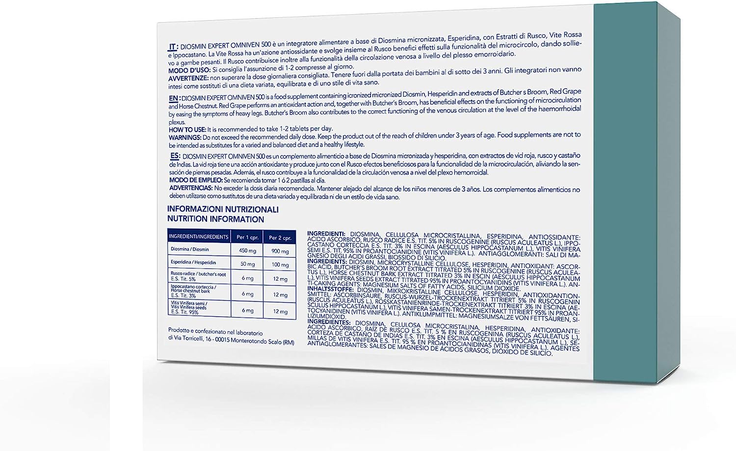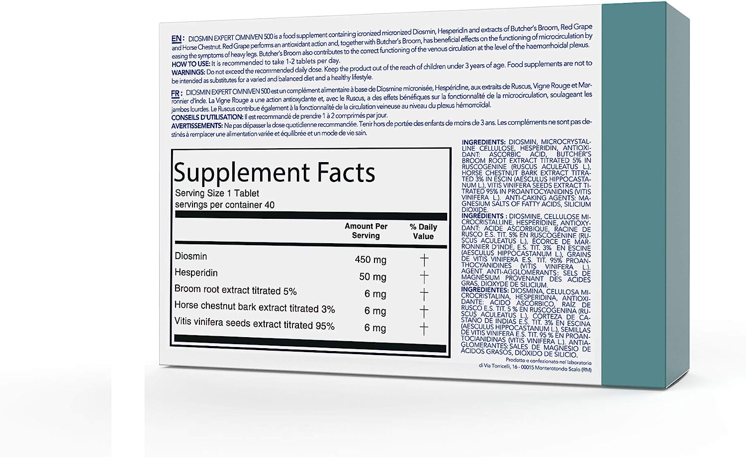 DIOSMIN, MICROCRYSTALLINE CELLULOSE, HESPERIDIN, ASCORBINIC ACID, RUSCUS ROOT DRY EXTRACT Titrated 5% (RUSCUS ACULEATUS), Horse Chestnut Bark Bark Dry Extract Titrated 3% (Aesculus US HIPPOCASTANUM), Vitis Vinifera seed dry extract titrated 95% (VITIS VINIFERA). Anti-agent: magnesium salts of fatty acids, silicon dioxide.
