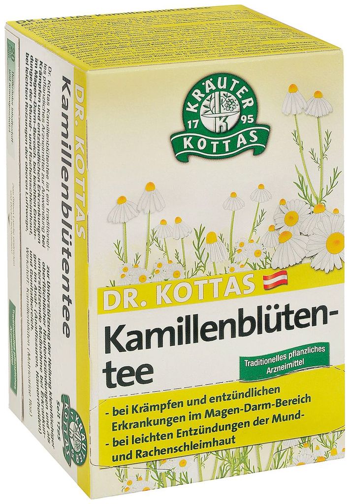 DR. KOTTAS chamomile blossom tea is a traditional herbal medicine for use in cramps and inflammatory diseases in the gastrointestinal area, in mild inflammation of the mouth and throat mucosa, in mild irritation of the upper airways, to support the healing of small areas superficial skin inflammation and as a supportive measure for diseases in the anal (anal fissures, haemorrhoids) and genital area.