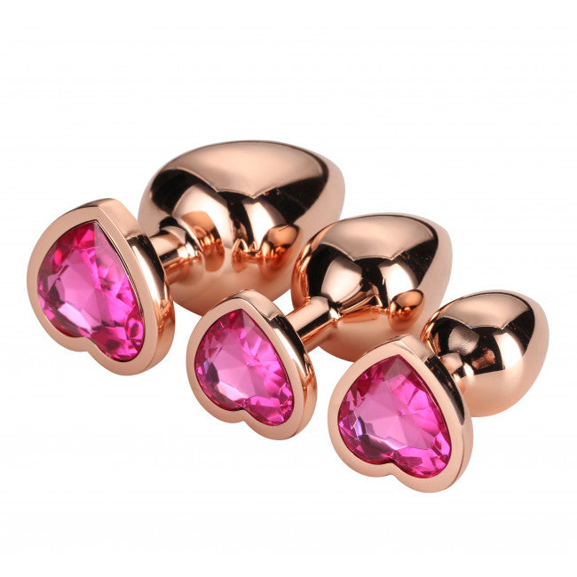 Do you love beautiful jewelry and want one for your anal? This is perhaps the most beautiful set of butt plugs ever! They have a loving rose-gold color and are finished with a pink sparkling heart- shaped stone . Enjoy their shape for easy insertion and erotic pleasure and try heating or cooling the plugs.