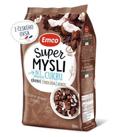 Chocolate Super Mysli with coconut from the Czech family company Emco is a premium crunchy muesli without added sugar. Made in the Czech Republic, from Czech oats. No added sugar. A natural source of fiber. Does not contain palm oil or added dyes.
