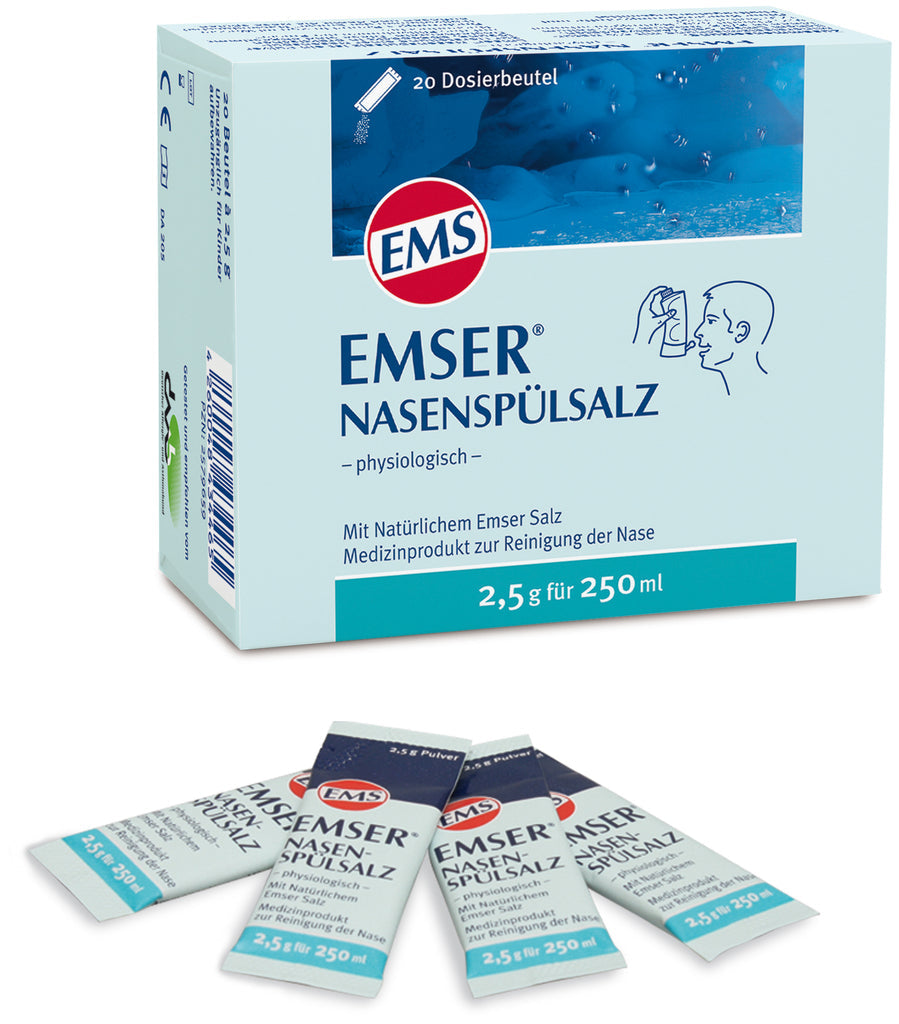 The specially developed Emser® nasal rinsing salt is recommended for prevention and gentle cleaning of the nasal mucosa from allergens and cytokines. Due to its physiological composition of minerals, it is well suited for moistening the nose in the case of dry mucous membranes and for regular rinsing treatments in which the focus is on mechanical cleaning of the nose - e.g. B. in hay fever or chronic dust-exposed patients.