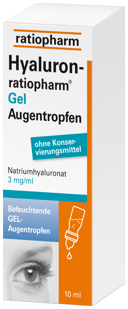 Hyaluron-ratiopharm® eye drops are a medical device for moistening dry, irritated or burning eyes and are now also available as GEL eye drops for intensive moisturizing of the surface of the eye. Hyaluron-ratiopharm® eye drops and Hyaluron-ratiopharm GEL eye drops. They are based on the natural tear fluid (artificial tears) and create a pleasant, refreshing feeling in the eye. One drop is enough to restore normal tear volume. Depending on your needs, the drops can also be used several times a day.