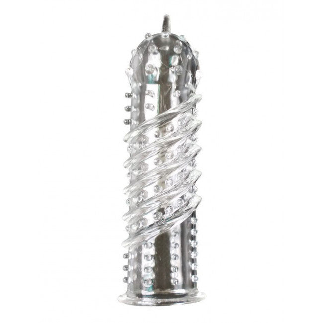 Very soft and flexible sleeve with protrusions all over the surface. Length is 15 cm and diameter is 2.5 cm and easily stretchable.