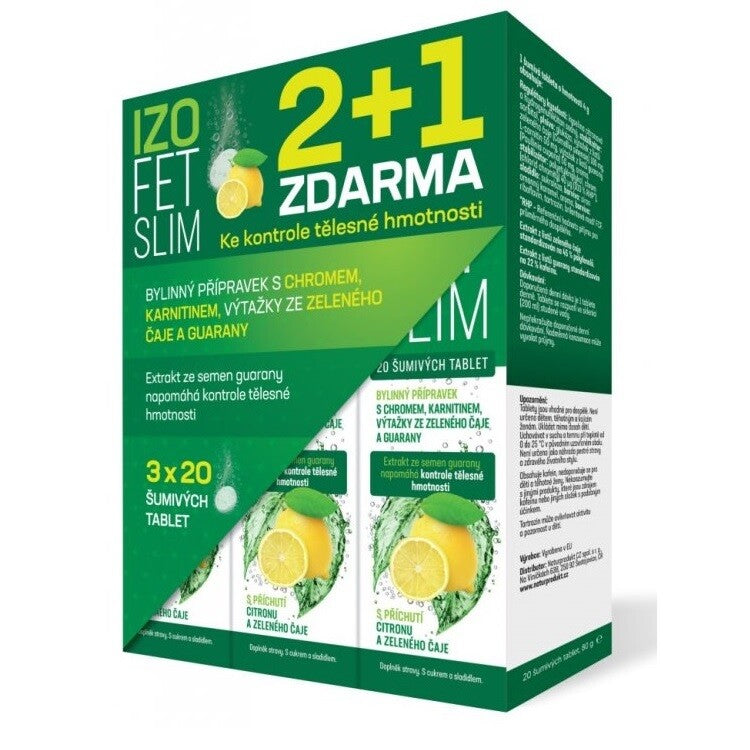 Izofet Slim is a dietary supplement in the form of effervescent tablets. Contains green tea extracts, guarana, L-carnitine & chromium Flavoured with lemon & green tea