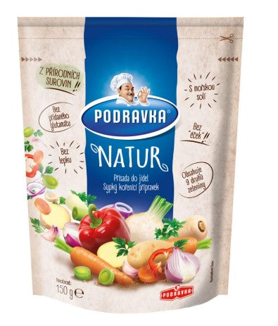 Podravka Natur is a food additive made from purely natural ingredients - sea salt, 9 types of vegetables, spices and herbs. Without gluten, without 'e's', without added glutamate or yeast extract, suitable for vegetarians and vegans. 480 g of fresh vegetables were used to produce a 150 g pack.