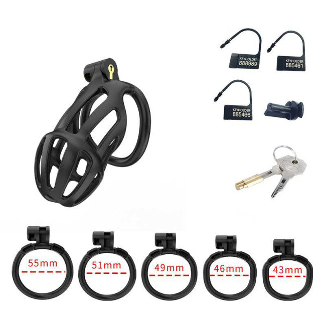 The cage has openings in the front that do not obstruct physiological needs and the cage wearer will be able to urinate comfortably. In addition to the cage itself, the set includes 5 rings in different sizes (43 - 55 mm), a copper lock and 3 disposable plastic locks and 2 plastic screws.