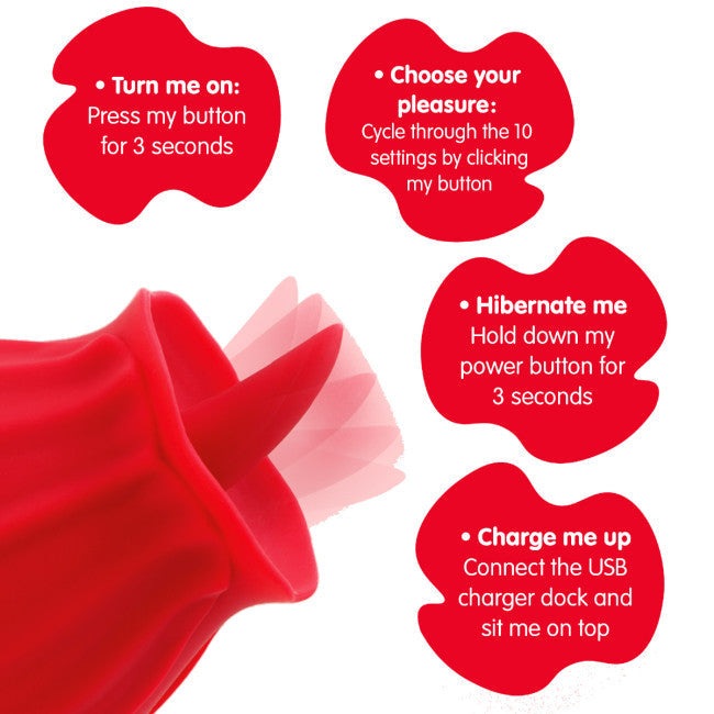 Made from luxurious silicone that's silky soft to the touch and completely body-safe, the rose features a satisfying tongue at the center of its bloom, designed to mimic sensual licking. Choose from 10 motion modes and 10 pleasure settings to find the way you like best.