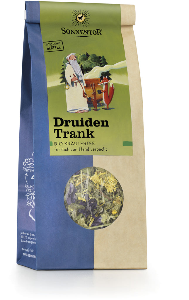 Awaken the magical powers! The tea, shimmering in an intense yellow, does not require any magic and still enchants with its spicy, minty taste and a light, fruity lime note. Comparable to a young, fruity white wine, it goes wonderfully with fish, cheese and pasta dishes as well as wild garlic and spinach. The Druid potion is packaged by hand at the Kainz family farm. Obelix and you will love him!
