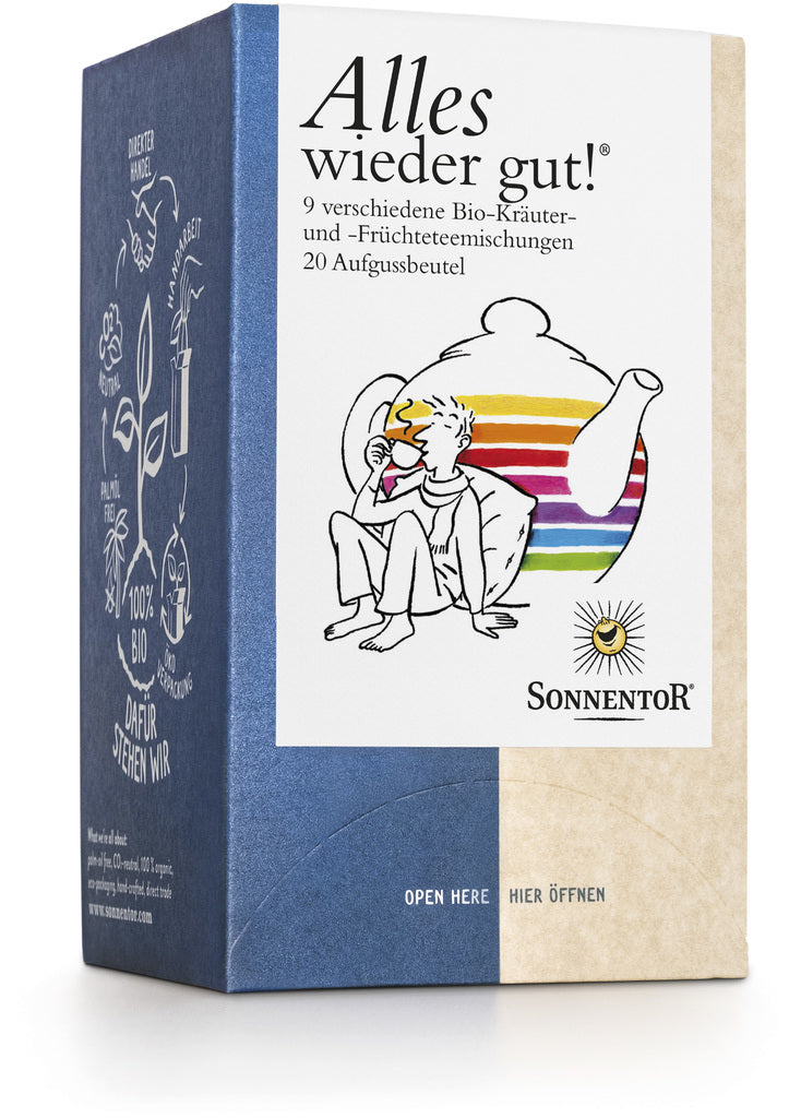 A herb has grown against everything. All teas are good again! Series combined in one pack. From “purely a matter of nerves” to “for the gut feeling” – the right tea for every occasion and every ailment. So everything is back to normal very quickly. A must on the herbal tea shelf.