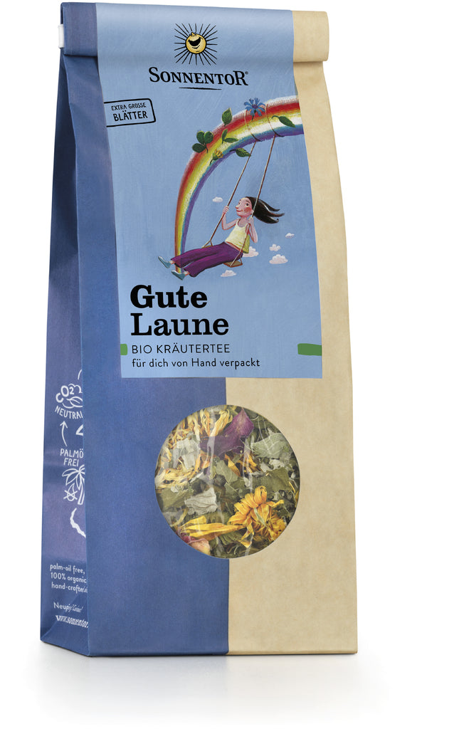 A good mood is contagious. It's clear that this herbal tea puts you in a good mood, because it shimmers in the cup in an equally bright yellow. The aromatic composition ensures a cheerful mood with a fruity mint note that goes well with fish, pasta and light summer desserts. With a velvety-soft finish, Good Mood is very popular even with the littlest ones among us. The dried herbs are packaged by hand so that the essential oils are preserved as well as possible. Please smile!