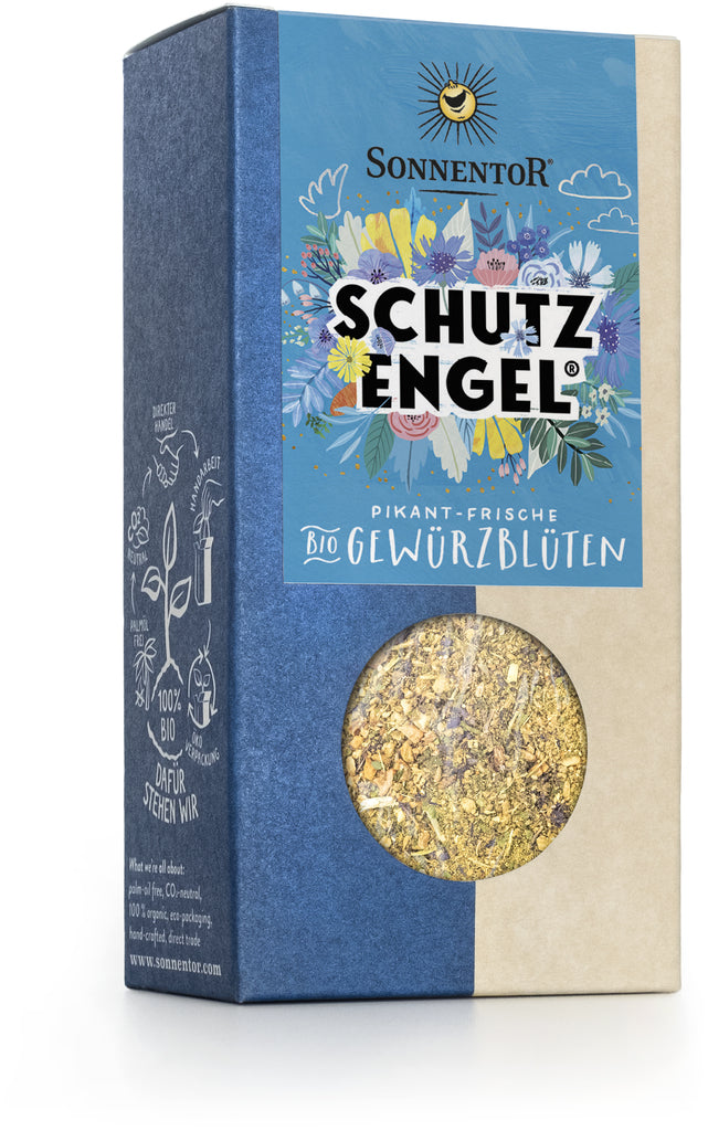 With this heavenly, fresh mixture of spices and flowers you will experience your blue wonder. Mint, coriander and orange peel give life to fish dishes, quiche, cheese and salad dressings. Cornflowers add a splash of blue color to the plate. Recommended by your guardian angel!