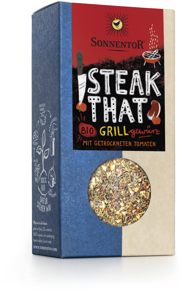 A steak cooked over hot coals deserves a special seasoning. It has to be uncomplicated and aromatic like the meat itself. This mixture delights with rosemary and dried tomatoes. It is simply mixed with oil. Before AND after grilling, brush the meat with the mixture and let it rest briefly before enjoying.