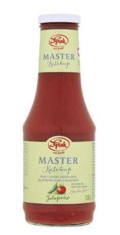 Ingredients: Tomato puree (200 g of tomatoes per 100 g of ketchup), Sugar, Drinking water, Fermented spirit vinegar, 4% jalapeño pepper, Edible salt, Aroma, Chili, Spice mix