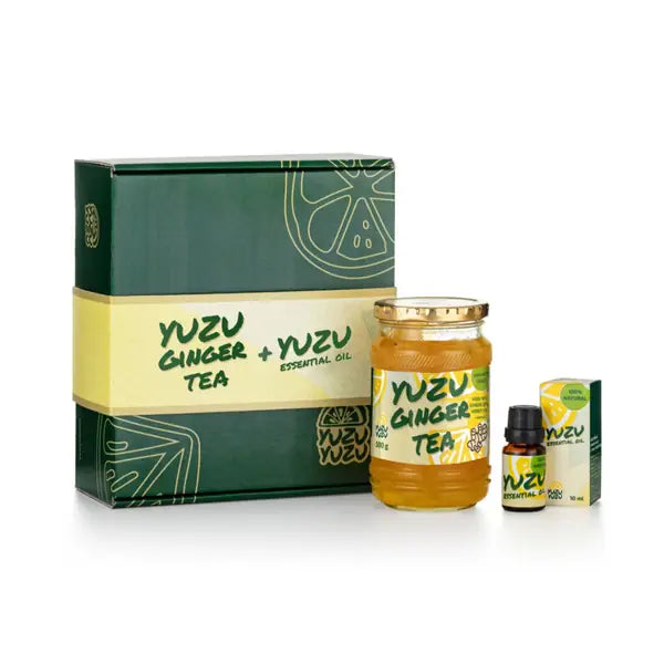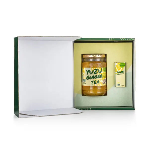 Are you looking for a gift for your loved ones that will be original, fresh and luxurious at the same time? The YuzuYuzu Harmony Healthy Basket is just the thing! Contains ginger Yuzu tea (500 g) and Yuzu essential oil (10 ml). Yuzu Tea is a traditional Korean drink made from Yuzu citrus, ginger and honey. Yuzu lemon is a small round citrus with a thick uneven peel and a large content of stones. Its taste is spicy, sour and bittersweet – like lemon, grapefruit and tangerine in one. According to a traditional Asian recipe, more than a thousand years old, it is processed by preservation in honey and sugar. Citrus processed in this way retains a high content of natural vitamin C, which supports immunity and contributes to the protection of cells from oxidative stress. 100% Yuzu essential oil is cold-pressed from the peel of East Asian citrus fruits (Citrus junos). Aromatherapy can help you in times of stress and tension. It also inspires creativity, uplifts the mind and helps the body relax.